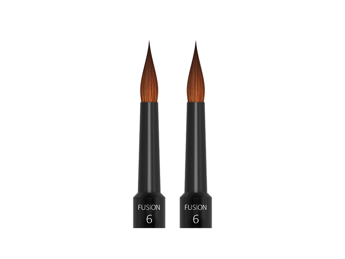 Die Pinselspitzen der FusionBrush-Serie bestehen aus einem Kern von Premium-Synthetikfasern die von Kolinsky-Haar umhüllt werden. Damit bietet der Pinsel eine von Kolinkiy-Haar gewohnte hohe Wasserspeicherfähigkeit, eine enorme Spannkraft und eine fein konturierte Pinselspitze.Der ergonomisch geformte, leichte Griff besteht aus eloxiertem Aluminium. Durch das magnetische Spitzelwechselsystem werden die Pinsel nur aufgesteckt – sie wackeln nicht und lassen sich nicht abschütteln.