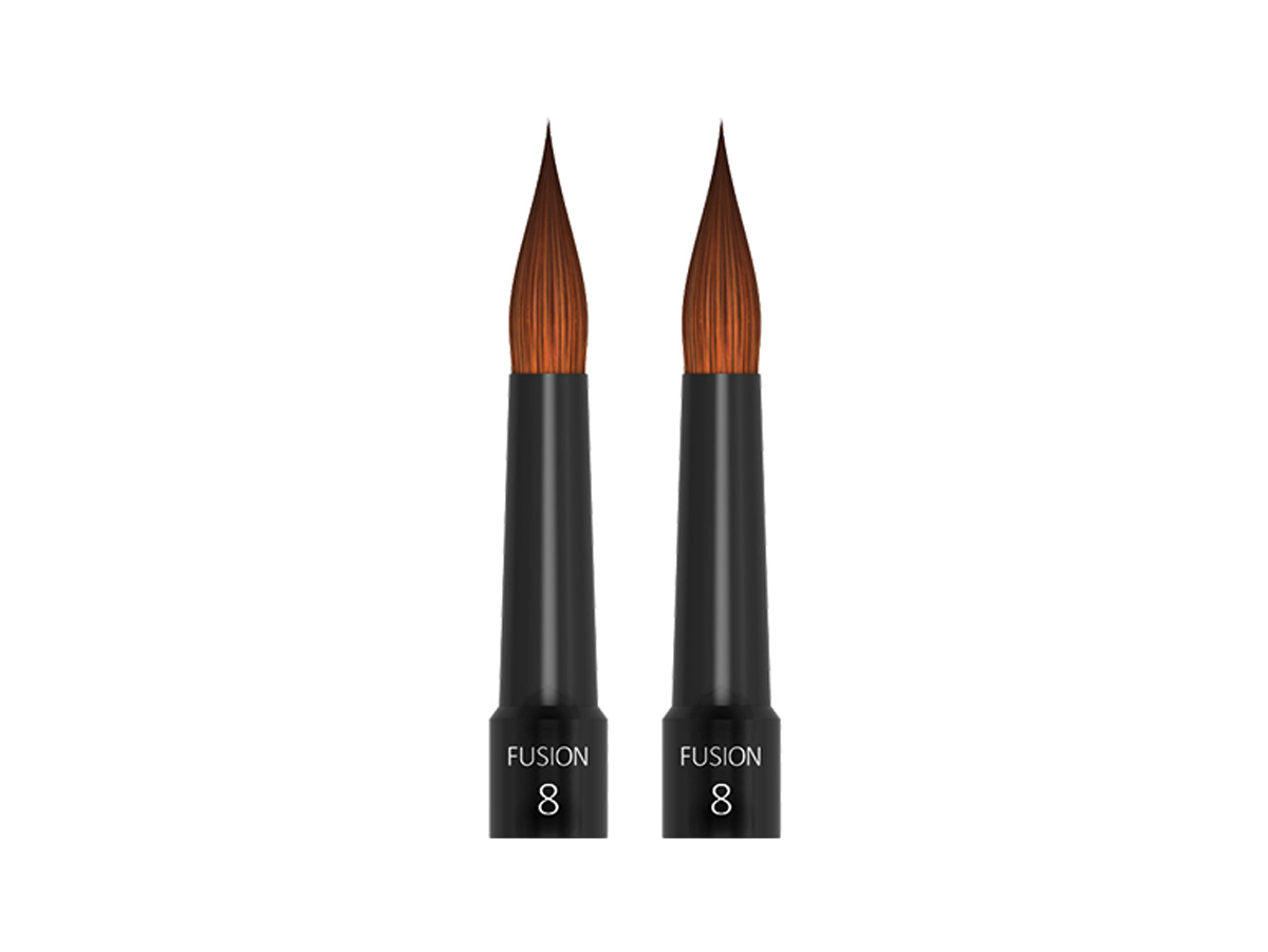 Die Pinselspitzen der FusionBrush-Serie bestehen aus einem Kern von Premium-Synthetikfasern die von Kolinsky-Haar umhüllt werden. Damit bietet der Pinsel eine von Kolinkiy-Haar gewohnte hohe Wasserspeicherfähigkeit, eine enorme Spannkraft und eine fein konturierte Pinselspitze.Der ergonomisch geformte, leichte Griff besteht aus eloxiertem Aluminium. Durch das magnetische Spitzelwechselsystem werden die Pinsel nur aufgesteckt – sie wackeln nicht und lassen sich nicht abschütteln.